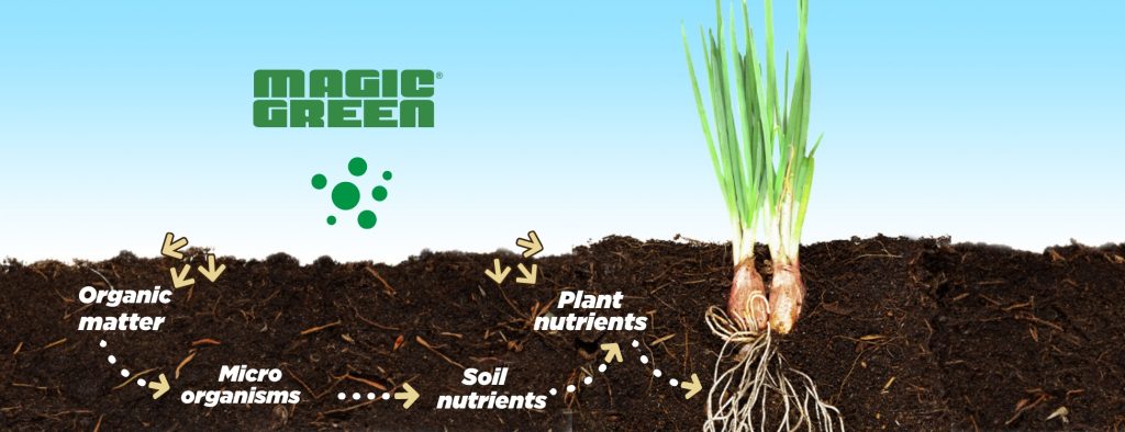 Magic Green provides amino acids, vitamins, phytohormones, and microorganisms that stimulate the growth of beneficial microbial colonies in the soil, enhancing nutrient absorption by plants.